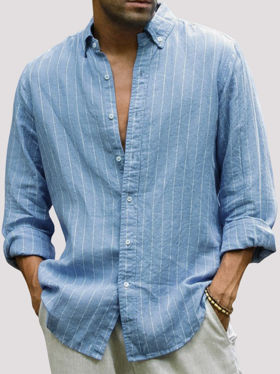 Men's Casual Cotton Striped Basic Solid Color Lapel Long Sleeve Shirt